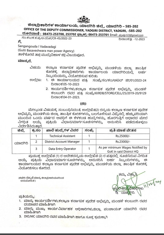 DC Office Yadgir Recruitment 2024: ಜಿಲ್ಲಾಧಿಕಾರಿಗಳ ಕಚೇರಿ ಯಾದಗಿರಿ (DC Office Yadgir ) ಖಾಲಿ ಇರುವ ಹುದ್ದೆಗಳನ್ನು ಭರ್ತಿ ಮಾಡಲು ಅರ್ಹ ಅಭ್ಯರ್ಥಿಗಳಿಂದ ಅರ್ಜಿ ಆಹ್ವಾನಿಸಿದೆ. ಒಟ್ಟು 3 ಟೆಕ್ನಿಕಲ್ ಅಸಿಸ್ಟೆಂಟ್, ಡೇಟಾ ಎಂಟ್ರಿ ಆಪರೇಟರ್ ಹುದ್ದೆಗಳು ಖಾಲಿ ಇದ್ದು, ಆಸಕ್ತರು ಅರ್ಜಿ ಸಲ್ಲಿಸಬಹುದು. ಜನವರಿ 3, 2024 ಅರ್ಜಿ ಸಲ್ಲಿಸಲು ಕೊನೆಯ ದಿನವಾಗಿದೆ. ಆಸಕ್ತರು ಆನ್ಲೈನ್ (Online) ಮೂಲಕ ಅಪ್ಲೈ ಮಾಡಬೇಕು. ರಾಜ್ಯ ಸರ್ಕಾರದ ಉದ್ಯೋಗ ಹುಡುಕುತ್ತಿರುವ ಸ್ಥಳೀಯ ಅಭ್ಯರ್ಥಿಗಳು ಈ ಅವಕಾಶವನ್ನು ಸದುಪಯೋಗಪಡಿಸಿಕೊಳ್ಳಿ.